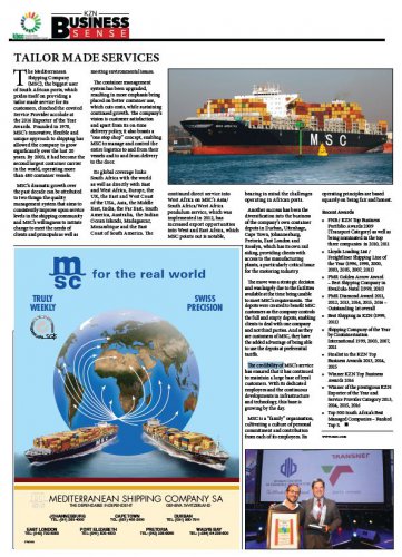 second largest container carrier in the world, operating more than 480 container vessels. MSC's dramatic growth over the past decade can be attributed to two things: the quality management system that aims to consistently improve upon service levels in the shipping community and MSC's willingness to initiate change to meet the needs of clients and principals as well as meeting environmental issues. The container management system has been upgraded, resulting in more emphasis being placed on better container use, which cuts costs, while sustaining continued growth. The company's vision is customer satisfaction and apart from its on-time delivery policy, it also boasts a "one stop shop" concept, enabling MSC to manage and control the entire logistics to and from their vessels and to and from delivery to the door. Its global coverage links South Africa with the world as well as directly with East and West Africa, Europe, the UK, the East and West Coast of the USA, Asia, the Middle East, India, the Far East, South America, Australia, the Indian Ocean Islands, Madagascar, Mozambique and the East Coast of South America. The continued direct service into West Africa on MSC's Asia/South Africa/West Africa pendulum service, which was implemented in 2012, has increased export opportunities into West and East Africa, which MSC points out is notable, bearing in mind the challenges operating in African ports. Another success has been the diversification into the business of the company's own container depots in Durban, Uitenhage, Cape Town, Johannesburg, Pretoria, East London and Rosslyn, which has its own rail siding, providing clients with access to the manufacturing plants, a particularly critical issue for the motoring industry. The move was a strategic decision and was largely due to the facilities available at the time being unable to meet MSC's requirements. The depots were created to benefit MSC customers as the company controls the full and empty depots, enabling clients to deal with one company and not third parties. And as they are customers of MSC, they have the added advantage of being able to use the depots at preferential tariffs. The credibility of MSC's service has ensured that it has continued to maintain a large base of loyal customers. With its dedicated employees and the continuous developments in infrastructure and technology, this base is growing by the day. MSC is a "family" organisation, cultivating a culture of personal commitment and contribution from each of its employees. Its operating principles are based squarely on being fair and honest. Recent Awards